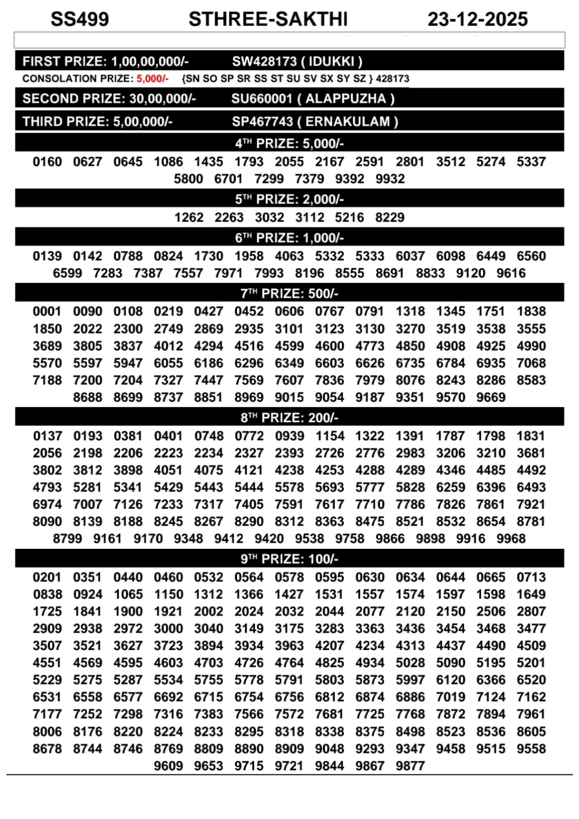 Sthree Sakthi Lottery Result SS-499 Today | Kerala Lottery